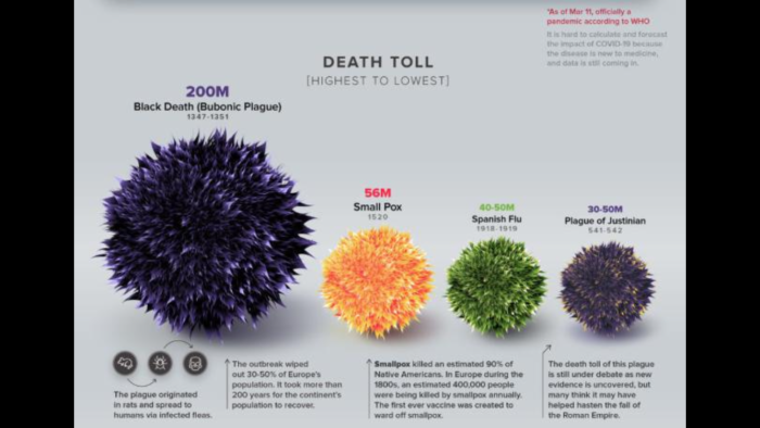 ,,Rata deceselor a pandemiilor trecute demonstreaza impactul masiv pe care un virus necontrolat il poate avea asupra populatiei globale. Numerele din graficele de mai jos intaresc nevoia de practici de siguranta precum distantarea sociala, inclusiv munca de acasa si intalniri virtuale cu prietenii, decat fata in fata”.