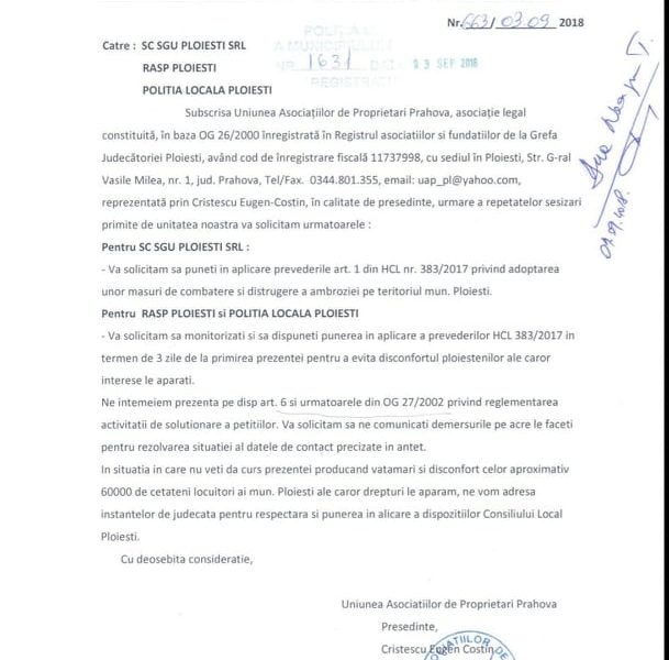 „Urmare a adresei dumneavoastra ref/170/2021, inregistrata la institutia noastra sub nr 419/15.06.2021 si repartizata Biroului Protectia Mediului la data de 17.06.2021” – Ziarul Incisiv de Prahova