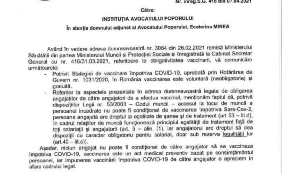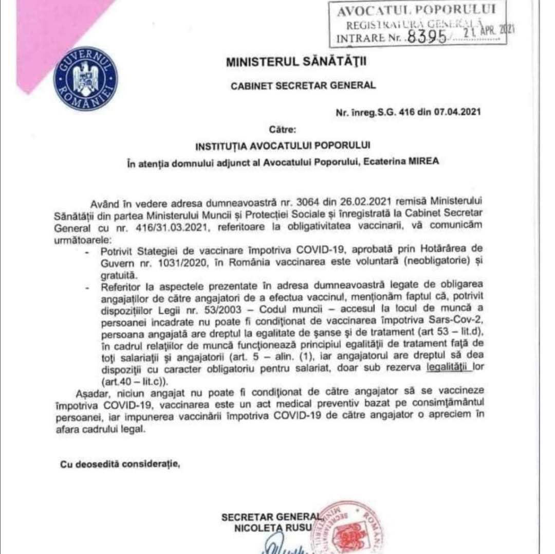 Acest lucru este întărit de răspunsul Ministerului Muncii și Protecției Sociale adresat Instituției Avocatului Poporului. Conform considerentelor acestora, vaccinarea trebuie să fie voluntară(neobligatorie), accesul la muncă nu poate fi condiționat de vaccinarea împotriva Sars-Cov-2, persoana angajată având dreptul la egalitatea de șanse și tratament, iar angajatorul are dreptul să dea dispoziții cu caracter obligatoriu pentru salariat, doar sub rezerva legalității lor.