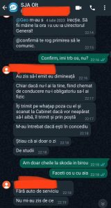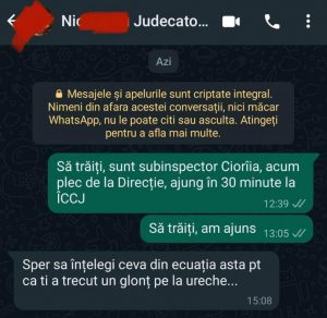 Aceștia mi-au zis să mă duc la doamna psiholog și după aceea să mă deplasez către domnul judecător pentru a îmi cere scuze( lucru pe care eram gata să îl fac pentru că îmi era frică de influența pe care acesta o are asupra instituției din care fac parte, instituție care ar fi trebuit să nu fie influențată de presiunile politice și de presiunile magistraților, lucru care m-a șocat și m-a lăsat cu un dezgust total). După discuțiile purtate cu doamna psiholog, de altfel, singura care a fost dispusă să asculte și punctul meu de vedere( de reținut că si aceasta a fost probabil o forma de intimidare a mea, pentru a îmi arăta ca aceasta este o metoda pe care domnul Director General si doamna Director General Adjunct o pot folosi pentru a îmi face rău), m-am deplasat către Înalta Curte de Casație si Justiție, sens în care i-am dat mesaj domnului judecător în momentul în care am plecat de la Direcția Generală Anticorupție, spunându-i că ajung în 30 minute, și încă un mesaj în momentul în care am ajuns. Am așteptat în fața Înaltei Curți de Casație si Justiție aproximativ o oră, fără să primesc vreun mesaj de la domnul judecător ( aceasta fiind dispoziția dată de domnul Director General Liviu Vasilescu, să aștept acolo oricât ar fi necesar), iar la un moment dat primesc un apel telefonic de la doamna Director General Adjunct, Manuela Popescu care îmi comunică că domnul judecător Nicolescu Alin Sorin este la sediul Direcției Generale Anticorupție si că pot pleca spre casă, lucru pe care l-am și făcut. La un moment dat, la ora 15:08, respectiv 15:09 primesc două mesaje pe WhatsApp din partea domnului judecător Nicolescu Alin Sorin, mesaje care spun următoarele lucruri ” Sper să înțelegi ceva din ecuația asta pt ca ti a trecut un glont pe la ureche…” respectiv „..si atentie la steroizi ca o aa ti prajeasca creierul”.