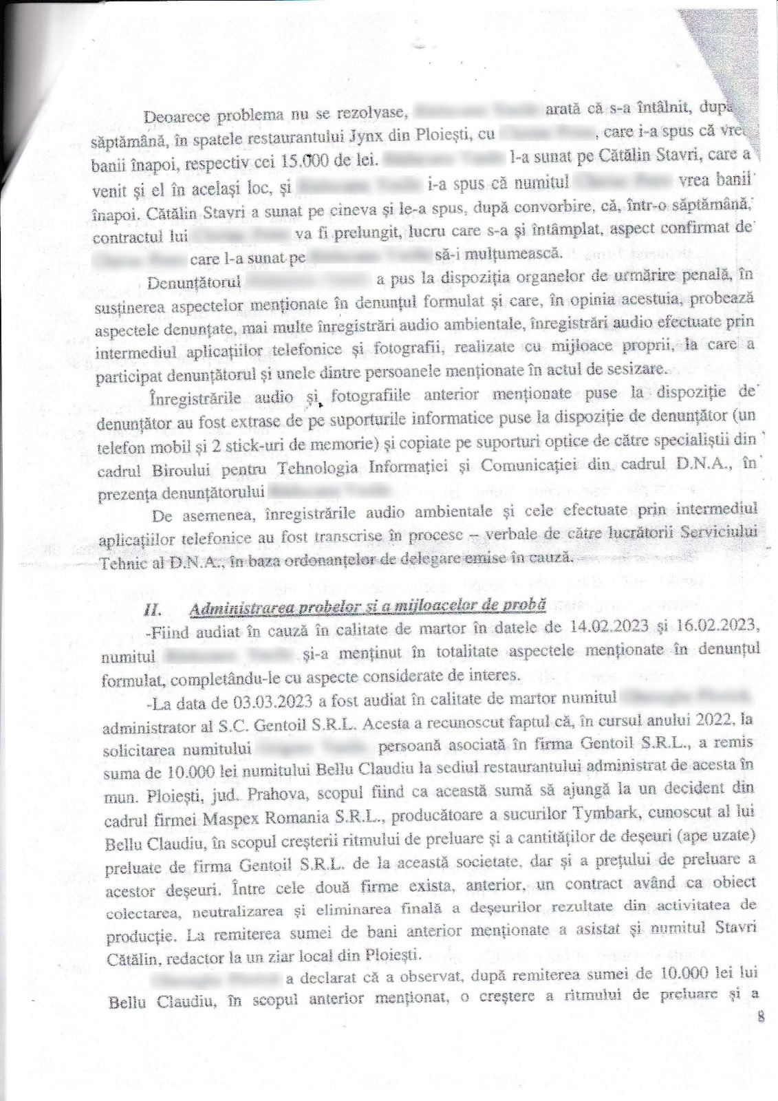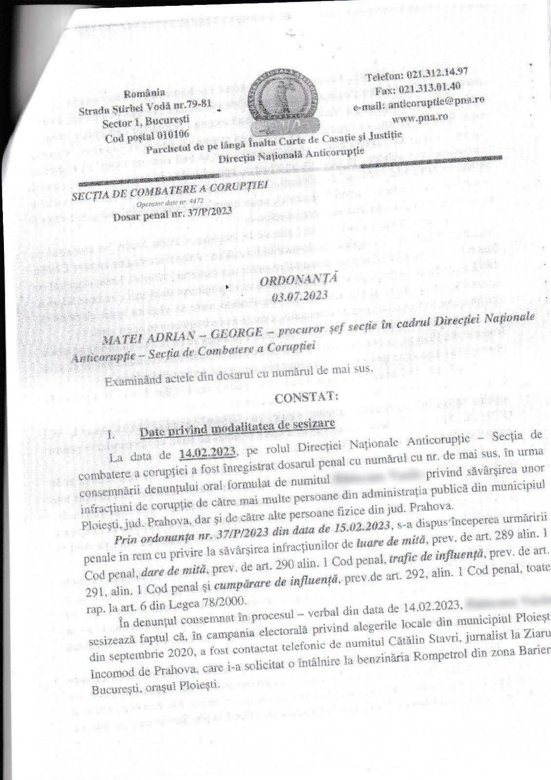 In dosarul penal nr 37/P/2023, procurorul sef de sectie din cadrul DNA ST Ploiesti, Matei Adrian George a constatat mai multe fapte penale savarsite de acesta grupare de criminalitate economico – financiara organizata si a disjuns cauza catre Parchetul de pe langa Tribunalul Prahova cu toate probele si inregistrarile audio: „inregistrarile audio ambientale si cele efectuate prin intermediul aplicatiilor telefonice au fost transcrise in procese-verbale de catre lucratorii Serviciului Tehnic al DNA in baza ordonantelor de delegare in cauza”.